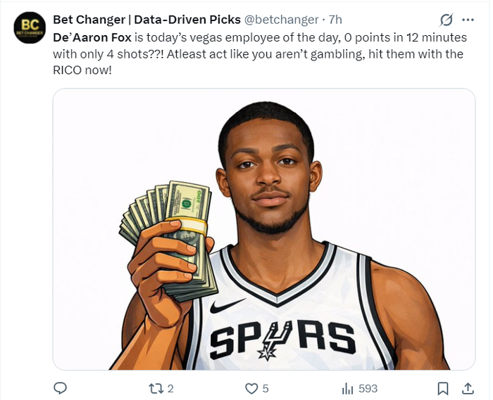 这场比赛马刺有两大罪人,一个是福克斯,一个是卡斯尔,福克斯肯定是最大的罪人,他全场比赛30分钟,18中4,三分8中1,拿到9分8助攻5篮板2失误,命中率22.2%,三分命中率12.5%,真实命中率25%,正负值-18。